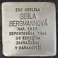 HERE LIVED BEILA BERGMANNOVÁ BORN 1897 DEPORTED 1942 TO THERESIENSTADT MURDERED IN BARANOVICHI |
