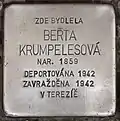 HERE LIVED BERTA KRUMPELESOVÁ BORN 1859 DEPORTED 1942 MURDERED 1942 IN THERESIENSTADT |