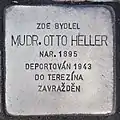 MUDr. Otto Heller, also Ota, was born on 3 July 1895. He became a physician and married Johanna née Skallová (1901–1981). The couple had one daughter, Zuzana (born 1927). On 5 July 1943 he was deported with his wife and his daughter with transport De from Prague to Theresienstadt concentration camp. His transport number was 401 of 604. On 6 September 1943 he was deported, again with his wife and daughter Zuzana, with transport Dl to Auschwitz concentration camp. His transport number was 761 of 2484. He — as well as 2451 other Jews from this transport — was murdered by the Nazi regime.[32][33][34]