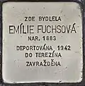 HERE LIVED EMÍLIE FUCHSOVÁ BORN 1883 DEPORTED 1942 TO THERESIENSTADT MURDERED |