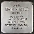 Ervín Pfeffer was born on 28 October 1909 in Prague. He was employed at a bank and married to Martha Pfeffer née Kraus. The couple had two children: Alena (born 1937) and Jiřina (born 1941). On 23 July 1942, Ervín Pfeffer was deported from Prague to Theresienstadt concentration camp, together with his wife and his two daughters with transport AAt (his number on the transport was the 537). From there he was deported to Auschwitz concentration camp on 1 October 1944, with the transport Em (his number on the transport was the 913). From here he was deported to Dachau at an unknown time and murdered there in 1945.[43][44][45]