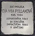 HERE LIVED EVA MIA POLLAKOVÁ BORN 1924 DEPORTED 1941 TO THERESIENSTADT MURDERED 1944 IN AUSCHWITZ |