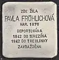 HERE LIVED PAVLA FRÖHLICHOVÁ BORN 1876 DEPORTED 1942 TO THERESIENSTADT 1942 TO TREBLINKA MURDERED |