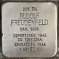 HERE LIVED RUDOLF FREUDENFELD BORN 1903 DEPORTED 1942 TO THERESIENSTADT MURDERED 1944 IN AUSCHWITZ |