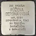 HERE LIVED RŮŽENA BERGMANNOVÁ BORN 1931 DEPORTED 1942 TO THERESIENSTADT MURDERED IN BARANOVICHI |