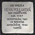 HERE LIVED VILMA POLLAKOVÁ NÉE ROUBÍČKOVÁ BORN 1897 DEPORTED 1941 TO THERESIENSTADT MURDERED 1942 IBIDEM |