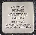 Eduard Kronberger was born on 30 July 1865 in Soběslav. He was one of ten children of Seligmann Kronberger (1830–1886) und Franziska geb. Rind (around 1835 in Přehořov – 1887 in Soběslav). He moved to Chodov, became a merchant and married Jenny née Löwy (born on 10 February 1875). The couple had five children: sons Walter (born 1896) and Oskar (born 1899) as well as daughters Franziska (born on 20. März 1898 in Chodov), Erna (born 1903) and Frieda. His wife died on 25 March 1929 in Chodov. After the Germans invaded, he was arrested and interned at the prison of Waldheim, Saxony. He was murdered by the Nazi regime on 30 October 1940.[6][7]