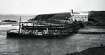 A narrow gauge (2-foot / 610mm) railway line ran from the quarries to the port, via Terralong Street, from 1914 until 1941. Hoppers and staithes for loading crushed stone were located on the eastern side of the Robertson Basin. Until 1936, a branch of the tramway, along Manning Street, also took stone to a set of staiths south of the Kiama railway station, where it was loaded onto wagons for transport by rail. The quarries at Kiama closed, in 1942, mainly due to 'Stone Fleet' ships being requisitioned by the navy.[1][7][8] Operations did not resume until 1947.[9]