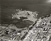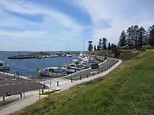 An artificial harbour was constructed in the 1880s,[19] with one breakwater running for 100 yards In a north-easterly direction and another to the south-east for 50 yards—from Cowrie Island—providing an entrance only 100 feet wide, with a depth of six feet of water.[16] The breakwater was extended westward around 1899,[20] to block completely the gap between Cowrie Island and the mainland.