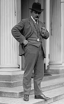 Borglum later stated that the Association asked him to write to people in Washington because of his contacts in the Republican Coolidge administration.[14] He wrote to the powerful Republican Massachusetts senator, Henry Cabot Lodge, urging him to support legislation for a Stone Mountain commemorative coin; the appeal apparently worked, as late in 1923 the committee chairmen having jurisdiction over coinage, Reed Smoot in the Senate and Louis Thomas McFadden in the House of Representatives, introduced legislation for a Stone Mountain Memorial half dollar. McFadden later wrote that he sponsored the legislation because of his friendship with Borglum. With the threat of sectional opposition if the coin only honored the South, the bill's sponsors included language making the new half dollar also in memory of the recently deceased Harding (an Ohioan), during whose presidency the renewed work had begun. The bill passed by unanimous consent in the House on March 6, 1924, and in the Senate five days later; Coolidge signed it on March 17.[15][16] The bill authorizing the coin read: