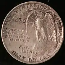 The obverse of the half dollar depicts Confederate generals Lee and Jackson, the latter with head bare, mounted on horseback. Although both Lee and Jackson were respected in the North, Davis would not have been acceptable on a federal coin, and he was omitted, although he appears on the Children's Founders Roll medal which Borglum adapted for the obverse of the half dollar.[26] There are thirteen stars in the upper field of the obverse; they represent the thirteen states which either joined the Confederacy or had Confederate factions. Borglum's initials, "GB", are found on the extreme right of the piece, near the horses' tails. The reverse depicts an eagle with wings stretched, representative of liberty, perched upon a mountaintop. There are 35 stars in the field, supposedly to represent the number of states at the start of the Civil War, although there were in fact 34 in 1861, and there were 35 states only from 1863 to 1864, between the admissions of West Virginia and Nevada.[5][27]