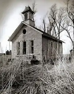 Horatio Stone moved to Scott County in 1839 and his brother Henry followed in 1844. The brothers established farms on Sections 5, 31, and 32 in Le Claire Township.[3] They each had a large family and together they built a log structure for use as a private school. The families built the present school in 1866, by which time six of Horatio's children and all six of Henry's children would have been able to have attended the school. The schoolhouse was eventually incorporated into the local public school system as Independent School District #1. The building ceased being a school in 1955 and it was used as a pig sty. It had fallen into disrepair before it was dismantled.