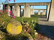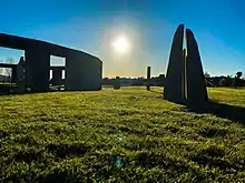 It contains 24 pillars and is 30 metres (98 ft) in diameter and about 4 metres (13 ft) high. The pillars are capped with lintels, completing the circle, and a 5 metres (16 ft)-tall obelisk is near the centre of the henge.[3] From the obelisk, along the meridian line is a 10-metres area called the analemma. The henge is similar to the sarsen cycle of the original Stonehenge and has the same diameter. Entry is via a causeway, which runs due west to the centre. Ten metres outside the circle of the henge stand six heel stones of varying heights.