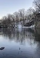 Bellevue Lake is a reservoir created by the impounding of Stoney Creek in 1936.[7] it has a capacity of 100 millions gallons of water.[8] Bellevue Lake is a remnant of the Old Bellevue Quarry,[9] which was allowed to fill.[10] (The harvested stone was used to build the Delaware Breakwater[11]) It is 0.2 miles (0.32 km) miles across[12] and covers 11 acres (4.5 ha). The reservoir supplied the Wilmington and Suburban Water Comopany, which was founded in 1933 and has since absorbed into Suez Water.[13]