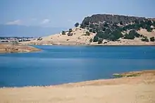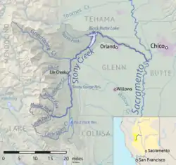 Black Butte Lake, formed by Black Butte Dam in Tehama County, is the largest reservoir on Stony Creek, covering more than 4,000 acres (1,600 ha) in the lower Coast Range foothills. A second tributary called North Fork Stony Creek joins in the reservoir from the west.[14] Downstream of Black Butte Dam surface water from Stony Creek is diverted into the Stony Creek Canal and other smaller ditches for irrigation.[15] The creek re-enters Glenn County, flowing in an east-southeast direction across the Sacramento Valley as a wide meandering stream.[16] North of Orland, the largest town in the watershed, it is crossed by Interstate 5.[17] It joins the Sacramento River south of Hamilton City and west of Chico at Sacramento river mile 190 (kilometer 306).[18]
