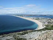 A noted textbook example is the 18-mile (29 km) long Chesil Beach in Dorset, one of three major shingle structures in Britain. It also connects the Isle of Portland to the mainland at Abbotsbury, west of the resort of Weymouth. Other examples appear in the Shetland and Orkney Islands, as well as the Scottish mainland at Caithness. The beaches of Lakshdweep Islands are also storm beaches.