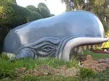 After departing from the dock, the boat passes through a short cave sculpted to look like Monstro, the whale that swallowed Pinocchio. Monstro is partially animated: his eye opens and closes, and periodically steam comes out of his blow hole.