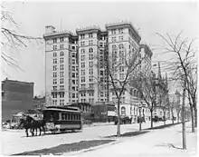 The World Cotton Centennial was held in New Orleans, Louisiana, from December 16, 1884, to June 2, 1885. It featured displays with a great deal of electric light illumination, an observation tower with electric elevators, and several prototype designs of electric streetcars.[10] Montgomery, Alabama, established its electric streetcar system nicknamed the Lightning Route on April 15, 1886.[11] Another early electrified streetcar system in the United States was established in Scranton, Pennsylvania, by November 30, 1886; it was the first system to be run exclusively on electric power, giving Scranton the nickname "The Electric City".[12][13] In 1887 an electric streetcar line opened between Omaha and South Omaha, Nebraska.[14] The Omaha Motor Railway Company began operation in 1888.[14]