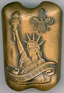 Strengthen the Arm of Liberty is the theme of the Boy Scouts of America's fortieth anniversary celebration in 1950.[1] The campaign was inaugurated in February with a dramatic ceremony held at the base of the Statue of Liberty (Liberty Enlightening the World). Approximately 200 BSA Statue of Liberty replicas were installed across the United States.