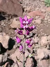 The purple flowers of Streptanthus carinatus var. carinatus
