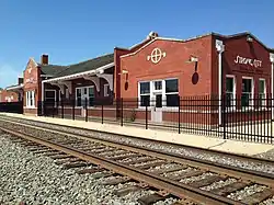The Strong City Atchison, Topeka & Santa Fe Depot is a historic railway station at 102 W. Topeka Avenue in Strong City, Kansas. The station was built by the Atchison, Topeka and Santa Fe Railway (ATSF) in 1913 to replace the city's previous station. The ATSF first built a line through the city in 1872, bypassing the county seat of Cottonwood Falls. To honor the railroad, the city changed its name from Cottonwood Station to Strong City in 1881 for ATSF vice president William Barstow Strong. Strong City's first railroad station was a simple wood building, and after a 1902 fire the town replaced it with a board-and-batten structure. In the early 1910s, the ATSF began replacing the stations in its most important stops with permanent brick buildings; the new stations were known as county-seat depots, as they typically served a county seat or the most important station in a county. The Strong City depot is typical of the ATSF's corporate architecture at the time and includes elements of the American Craftsman and Mission Revival styles. It served passenger trains until the late 1940s and continued to function as a railway office for many years afterward.[2]