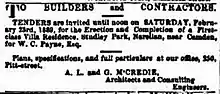 On 2 October 1888 businessman William Charles Payne bought the combined property of 200 acres from Thompson for £1,400. He authorised A. L. & G. McCredie of Sydney to construct the house, stables and a granary/engine house. The engine house reportedly contained a steam traction engine and a dynamo which provided electricity to the house. A lengthy article in the Australasian Building and Contractors News edition dated 20 July 1889 described the project. It called the house a "picturesque looking villa-residence, in a light Italian style". A rendered drawing view of the house from the west incorporated the two floor plans produce by the McCredies at the time of construction. The original drawings are in the Mitchell Library as part of a collection of architectural drawings belonging originally to a William Keen. He was a Sydney architect born in England and trained at the Royal Academy School, London, before migrating to Australia in 1886. It has not been able to be ascertained if Keen was employed by A. L. & G. McCcredie.[1]