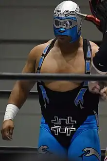 In late March 2013, Stuka Jr. was announced as a participant in the 2013 En Busca de un Ídolo ("In search of an Idol") tournament that took place from May to July 2013 as one of eight competitors.[31] From January 14 to 19, 2014, Stuka Jr. worked the New Japan Pro-Wrestling (NJPW) and CMLL co-produced Fantastica Mania 2014 tour, which marked his debut in Japan. For the entire tour, Stuka Jr. worked undercard matches alongside Rey Cometa.[32][33] On April 27, Stuka Jr. won the 2014 Reyes del Aire tournament, outlasting a field that included Averno, Mephisto, Ephesto, Mr. Niebla, Valiente, Tritón, Delta, Guerrero Maya Jr., Rey Cometa, Niebla Roja, Puma, and Tiger.[34][35] In January 2015, Stuka Jr. returned to Japan to take part in the Fantastica Mania 2015 tour, during which he unsuccessfully challenged Mephisto for the Mexican National Light Heavyweight Championship.[36] Stuka Jr. would go on to unsuccessfully challenge Mephisto for a championship on two further occasions, on July 5, 2015, and August 7, 2017.[37][38] Stuka Jr. and various partners would also unsuccessfully challenge Mephisto, Ephesto, and Luciferno for the Mexican National Trios Championship on four occasions between 2015 and 2016.[39][40][41][42]