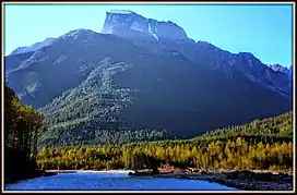 Stupendous Mountain was described by Sir Alexander Mackenzie on 17 July 1793: "Before us appeared a stupendous mountain, whose snow-clad summit was lost in the clouds."[4][5][6] A 1947 map confined the name Stupendous Mountain to the higher southern peak (2,697 m) on the massif; at the same time the northern peak was adopted as Table Mountain.[4] The landform's toponym was officially adopted as "Stupendous Mountain" on November 1, 1979, by the Geographical Names Board of Canada and was shifted to the lower northern peak, while the name "Table Mountain" was rescinded.[2] The mountain's Native American name is Chil-a-thlum-dinky.[7]