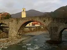 The stream rises from monte Orditano (Ceranesi municipality), in the Ligurian Apennine, with the name Sturetta (little Stura). After Piani di Praglia in Mele municipality it receives Rio di Fregeu from left hand assuming the name of Stura. In this brief part of its course the Stura marks the border between the regions of Piemonte and Liguria, and the right part of its valley is encompassed in the Capanne di Marcarolo Natural Regional Park.[3] Leaving the border it flows eastward in Liguria but, not faraway from Passo del Turchino, turns North and reaches Masone and Campo Ligure receiving from the right hand its main tributaries, Rio Vezzulla and Torrente Ponzema. Crossing Rossiglione the Stura divides the town in Rossiglione Superiore (Upper Rossigline) and Rossiglione Inferiore (Lower Rossiglione). A couple of kilometres downstream it enters Piedmont between Belforte Monferrato and Ovada. It joins the Orba near the northern border of Ovada, at around 170 m.a.s.l.[4]