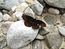 It has a wingspan of 46–56 mm.[2] The upperwings of both sexes are mostly brown with reddish bands near the edge (postdiscal bands). The bands vary in size and may be dusted with brown in the males.[3] Within the bands are a variable number of eyespots (ocelli); these are black with white centres. The forewing has a large eyespot near the tip, often with two white centres. The hindwing has three or four spots.[3]