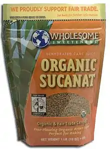 Sucanat (a contraction of "Sucre de canne naturel") is a brand name for a variety of whole cane sugar that was introduced by Pronatec in 1978. Like panela and muscovado, Sucanat retains its molasses content. It is essentially pure dried sugar cane juice. The juice is extracted by mechanical processes, heated, and cooled, forming small brown grainy crystals.