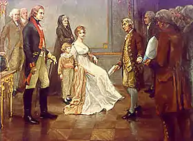 In addition, a large 1903 painting by Clara Elisabeth Fischer, commissioned by E.O. von Lippmann for the museum, depicts a fictional scene of Franz Carl Achard, the 'inventor' of beet sugar, presenting his discovery to King Frederick William III in the form of a sugarloaf; Achard actually sent his beet sugar to the king.[16][17][18] All known varieties of sugar beet today descend from the plants developed by Achard over 20 years of selective breeding in Kaulsdorf.[19]