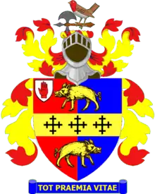 BlazonPer pale Gules and Azure a fess Or charged with three crosses-crosslet Sable between two boars passant Or that in chief facing the dexter and that in base the sinister.