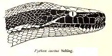 - ↑ Schlegel, H. (1872). "De Pythons". In Witkamp, P. H. (ed.). De Diergaarde van het Koninklijk Zoölogisch Genootschap Natura Artis Magistra te Amsterdam: De Kruipende Dieren. Amsterdam: Van Es. pp. 53–54.