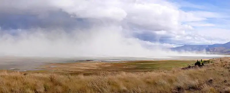 Today, Summer Lake and Abert Lake are separated by 20 miles (32 km) and are the only remnants of Lake Chewaucan.[4] At high water, Summer Lake is about 15 miles (24 km) long and 5 miles (8 km) wide; however, water levels fluctuate dramatically, and sometimes the lake is almost dry in summer.[3] The main source of fresh water is the small spring-fed Ana River, which is used for irrigation.[3][6]