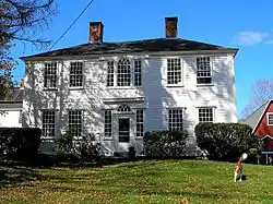 The Sumner-Carpenter House is located in a rural area east of Eastford center, on the north side of Old Colony Road just west of its crossing of Bungee Brook. It is a 2+1⁄2-story wood-frame structure, consisting of a main block and a series of additions. The main block has a hipped roof, with a side gable-roofed ell, apparently built either with or not long after the main block, with a gable roof, and a c. 1900 two story gable-roofed wing to the rear. The main facade is five bays wide, with a center entrance flanked by wide sidelights, and topped by a rounded transom and corniced entablature. The window above the entrance is in the Palladian style, with a rounded center window flanked by narrower sashes. The interior retains a number of original features, as well as sensitive reproductions of parts that were seriously deteriorated.[2]