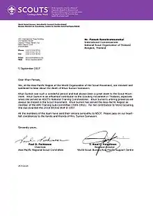 In 1997, Samasarn was awarded the 261st Bronze Wolf, the only distinction of the World Organization of the Scout Movement, awarded by the World Scout Committee for exceptional services to world Scouting.[1] Apart from that, Samasarn also received Asia-Pacific Region Chairman’s Award and Asia-Pacific Regional For Distinguished Service Award, given by Asia-Pacific Regional Scout Committee.
