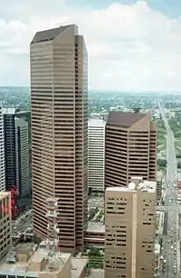 The Suncor Energy Centre,[5] formerly the Petro-Canada Centre, is a 181,000-square-metre (1,950,000 sq ft) project composed of two granite and reflective glass-clad office towers of 32 floors and 52 floors, in the office core of downtown Calgary, Alberta. The Council on Tall Buildings and Urban Habitat lists the west tower (215 m or 705 ft as measured to top of the structure), as the 23rd tallest building in Canada and the 6th tallest skyscraper outside of Toronto, as of 2023.[4] The west tower overtook the Calgary Tower as the tallest free-standing structure in Calgary from its completion in 1984, until being surpassed by the neighbouring Bow in 2010.[6] The office towers encompass 158,000 m2 (1,700,000 sq ft) of rentable office space with the complex also containing 23,000 m2 (250,000 sq ft) of retail and underground parking area. A glass-enclosed walkway (part of the +15 System) provides shelter and easy access to the surrounding buildings.