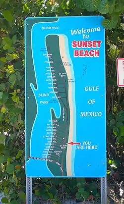 One of three main Treasure Island beaches, along with Sunshine and Mid-Island, it is primarily a residential beach neighborhood. Mid-century fisherman cottages mix with lush Key West-style homes, between the Gulf of Mexico and Boca Ciega Bay.[1] From the southern end of Sunset Beach, one can look directly across Blind Pass at Upham Beach in St. Pete Beach.