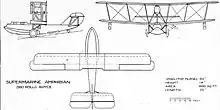 The Amphibian was a single-engined biplane flying boat with a wooden hull and unequal wingspans. The 350 horsepower (260 kW) Rolls-Royce Eagle engine was mounted between the wings in a pusher configuration (with the propeller mounted behind the engine). The tail had a single vertical fin, and single tailplane mounted halfway up the fin.[4][5] The front of the aircraft was designed to make sure that it lifted clear of the water prior to take-off, and the nose profile was similar to that of a boat. An innovation introduced by Mitchell was a mechanism to operate the ailerons simultaneously. The undercarriage was designed to be partially retractable.[4]