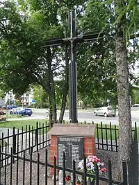On 22 November 1992, on the intersection of Wólczyńska Street and Wolumen Street was unvailed a metal Christian cross, and a plaque, commemorating the events of the Suppression of Wawrzyszew. The plaque includes names of 34 identified victims killed during the event, and additionally is dedicated to the unidentified civilians and soldiers of the Home Army, who were burried at the nearby Wawrzyszew Cemetery.[6]