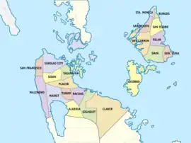 - 1 2 3 Lancion, Jr., Conrado M.; cartography by de Guzman, Rey (1995). "The Provinces; Surigao del Norte". Fast Facts about Philippine Provinces (The 2000 Millenium ed.). Makati, Metro Manila, Philippines: Tahanan Books. p. 154. ISBN 971-630-037-9. Retrieved April 29, 2016.
