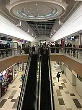 Unlike other shopping centres in the region, and owing to its unique two-stage development, the main building of Simon Fraser University's Surrey campus is located within the mall and occupies a major portion (33,000 m2 [350,000 sq ft]) of the podium floors.[6] The central atrium of the mall, similar to the hull of a ship, consists of retail space on the ground floor and provides a direct line of sight towards the campus hallways and classrooms on the upper floors.[7]