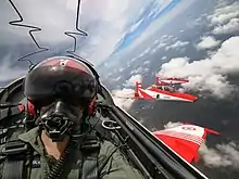In 1998, with Wg Cdr A K Murgai as the CO, the team expanded to a nine-aircraft formation. Considering the team was just two years old, it was no small achievement. The team first displayed a formation of nine-aircraft during the Independence Day fly past over the Red Fort in 1998. The first full-fledged nine-aircraft aerobatic display was to follow at Palam on 8 October 1998, to mark Air Force Day.[2] In November 1999, the Royal Air Force's Red Arrows aerobatic team was transiting through India en route to Australia. The Surya Kiran team was at Hindon to interact with them and a lucky few managed a sortie in the Hawk. Three months later the French aerobatic team ‘Patrouille de France’ was at Pune and the two teams met and flew some sorties in the Alpha jet. An interaction between the two teams resulted in the SKAT adopting the "Synchro" manoeuvre. This raised their standard a couple of notches and added more colour to its displays. The first synchro sequence was displayed during the Combined Graduation Parade at Air Force Academy in June 2000.[2]