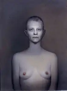 Susan Hauptman (1947–2015) was an American artist who worked exclusively on paper with charcoal, pastel and, later, other elements, such as gold leaf, wire mesh and thread. She is best known for her stark, enigmatic, often expressionless self-portraits in which she depicted herself with precise and candid detail in ways critics described as strikingly androgynous and that confronted cultural notions of beauty, reality, femininity and masculinity. She has had one-person shows in several museums including the Norton Gallery of Art, West Palm Beach, FL, the Oakland Museum, Oakland, CA and the Corcoran Gallery of Art, Washington, D.C.[2][3][1][4]