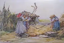 Apparently lacking financial support from her husband, Susanna Roope Dockery became for a time dependent on her extended family and friends. She took up watercolour painting as a profession. Her paintings were of the Porto area and she also took a small cottage at Afife to the north of Porto in what is now the municipality of Viana do Castelo. Many of her works feature the stone buildings and structures of that area and she also painted scenes of rustic life, of fishing boats, and of the grape harvest. Initially she sold her paintings to British people in Porto and some are still to be found in the houses of Anglo-Portuguese families. The favourable reception of her work encouraged her to seek a wider audience and in February 1897 she exhibited "76 Watercolour drawings of North Portugal" at a gallery in London's Mayfair. In 1899 her watercolours of Costumes of Minho and Douro were exhibited in Lisbon and two of the paintings were purchased by the Queen of Portugal.[1] In 1901 she exhibited a painting at the Royal Academy and she continued to exhibit at commercial galleries in London.