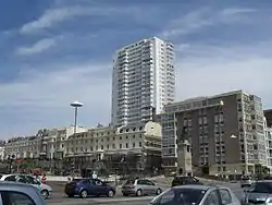 Opinion regarding Sussex Heights' architectural quality and its contribution to Brighton and Hove's cityscape and skyline is mostly negative.[22] Although it stands on the seafront, the lowest ground in the area (Brighton is built on a north–south slope, with the South Downs sloping towards the English Channel),[23] its height dominates the surroundings, which consist mostly of early 19th-century terraces of Regency-style houses of three and four storeys.[8][24] Its effect on both short- and long-distance views has led to it being called "appalling"[5] and the "most damaging" modern building in the city.[19] Other commentators have noted that it has an "imposing and prestigious" presence, and that it has become Brighton's main landmark (replacing the octagonal tower of the nearby St Paul's Church, which had this status for more than 100 years and was used as a reference point by generations of sailors).[8][25]