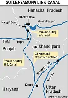 Satluj Yamuna Link Canal or SYL as it is popularly known, is an under-construction 214-kilometer (133 mi) long canal in India to connect the Sutlej and Yamuna rivers.[2] However, the proposal met obstacles[3] and was referred to the Supreme Court of India.[2] It was defined as river water sharing between the states of Punjab and Haryana.