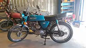 The Suzuki A100 is a Japanese motorcycle from the Suzuki Motor Corporation with production starting in 1966.[1]Similar models were produced by Yamaha and Kawasaki with the YB100 & KH100 models, also with a single-cylinder two-stroke engine and rotary valve being examples.