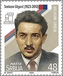 Svetozar Gligorić (Serbian Cyrillic: Светозар Глигорић; 2 February 1923 – 14 August 2012) was a Serbian and Yugoslav chess grandmaster and musician. He won the championship of Yugoslavia a record twelve times, and is considered the best player ever from Serbia. In 1958, he was declared the best athlete of Yugoslavia.